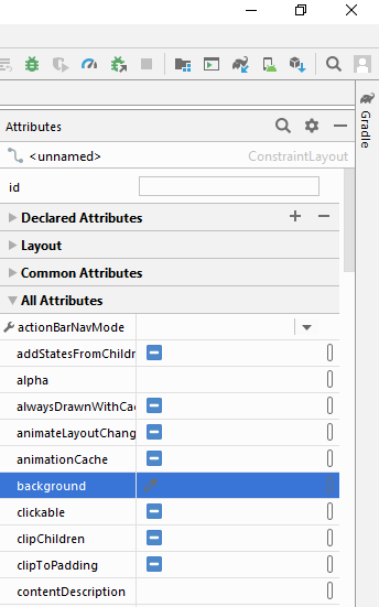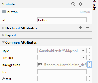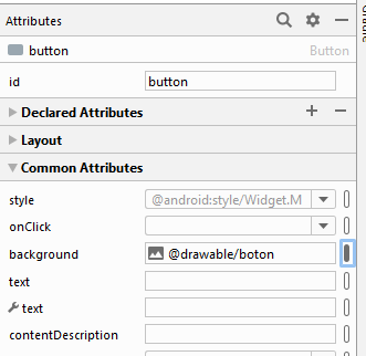 Una vez hecho esto procederemos a utilizar el recurso drawable creado por nosotros como boton, para esto debemos ir al campo background en las solapas Common Attibutes y seleccionar el boton resaltado en la siguiente imagen, esta opcion nos permitira cargar recursos en nuestro elementos como en este caso