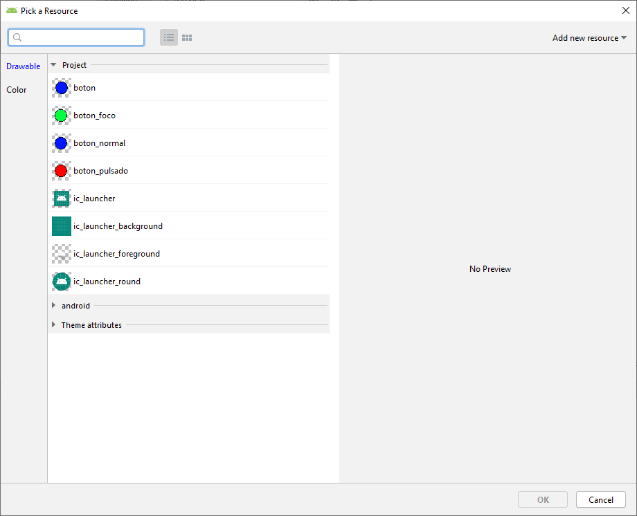 Aca deben seleccionar el recurso drawable y presionar Ok, donde aparecera el siguiente cuadro
