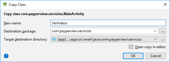 Luego copiaremos nuestra clase MainActivity por una nueva llamada VerVideos, pueden hacer click con el boton derecho y seleccionar Copy luego hacen Ctrl+V o click con el boton derecho y Paste sobre el contenedor de nuestras clases Java, una vez efectuado les aparecera el siguiente cuadro