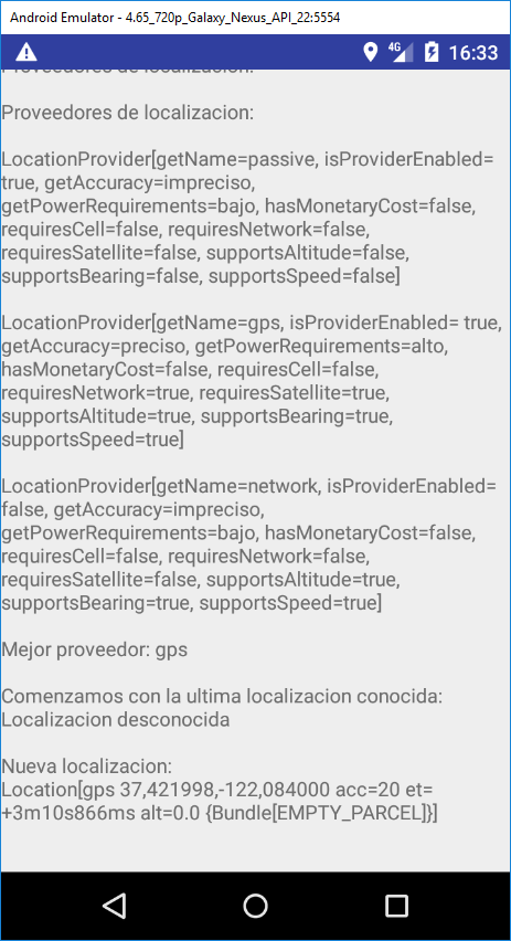 Con todos los permisos establecidos podremos probar nuestra app, si la probamos con nuestro emulador, preferentemente un Android menor al 6.0, obtendremos una salida como se ve a continuacion