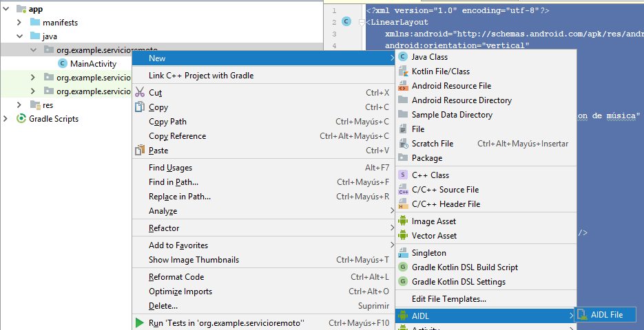 Retomando a nuestro ejemplo primero debemos crear una interfaz AIDL, para ello debemos hacer click con el boton derecho sobre org.example.servicioremoto y seleccionar New -> AIDL -> AIDL File como se ve en la siguiente imagen