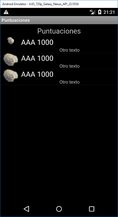Con esto si lo compilamos y probamos generaremos un archivo XML en la memoria interna de nuestro dispositivo (/data/data/com.tinchicus.asteroides/files/puntuaciones.xml) si lo buscan por Device File Explorer podran encontrarlo, aqui les muestro un ejemplo de como puede ser su estructura:
