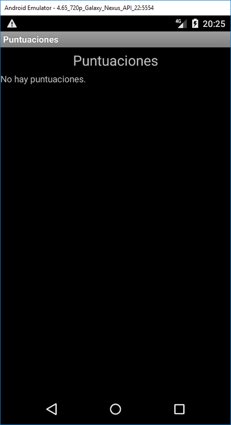 Con esta modificacion podremos probar nuestra app, si lo hacemos y clickeamos sobre la opcion puntuaciones obtendremos la siguiente situacion