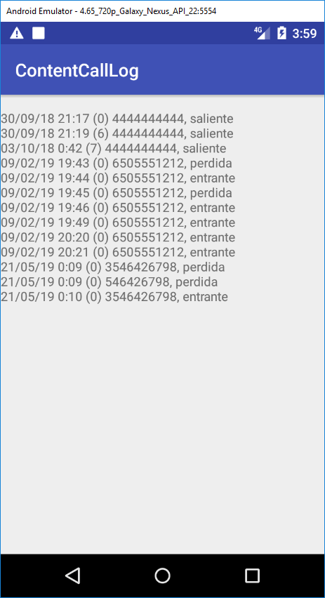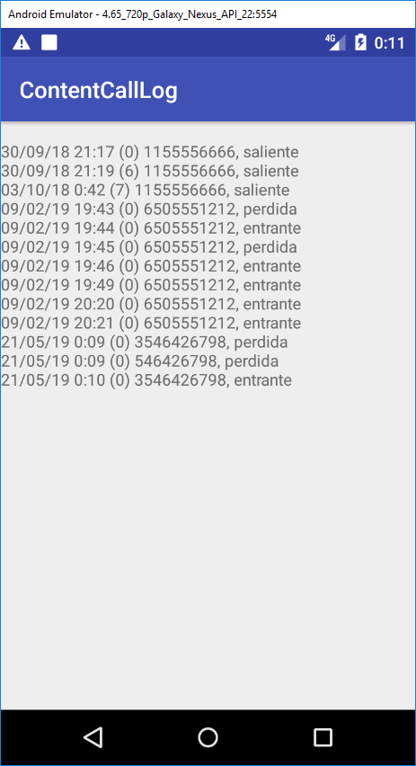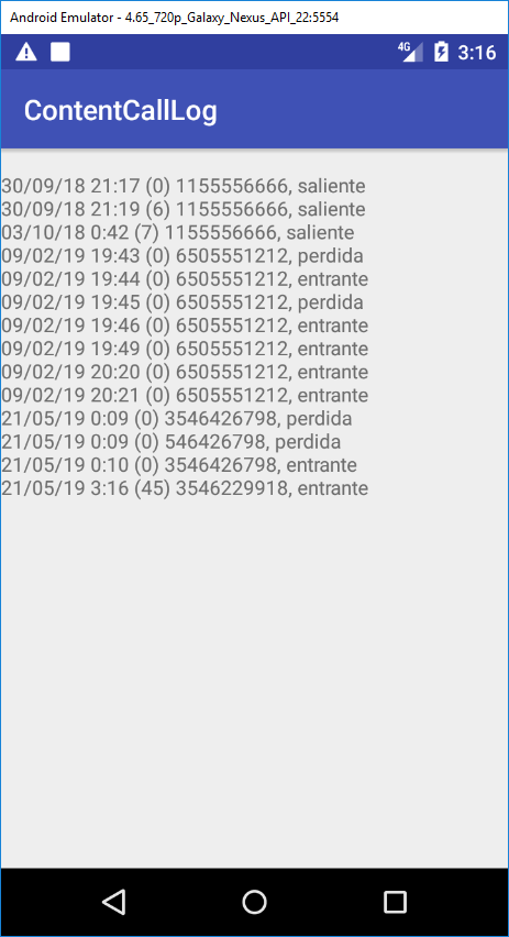 Obviamente las llamadas pueden variar con respecto a lo contenido en sus emuladores o dispositivo real pero pueden ver como primero sale la fecha y hora con la duracion de la misma, siguiendo el numero y el tipo de llamada si fue entrante, saliente o perdida.