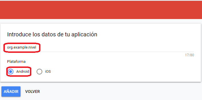 En este caso les resalte las dos opciones, la primera es el ingreso de nuestro paquete, en este caso use el dominio de ejemplo pero deben usar el dominio que pasaron para el ejemplo (si desean publicarlo) y debajo deben seleccionar la plataforma, con todo esto hecho pulsen Añadir para pasar a la siguiente pantalla