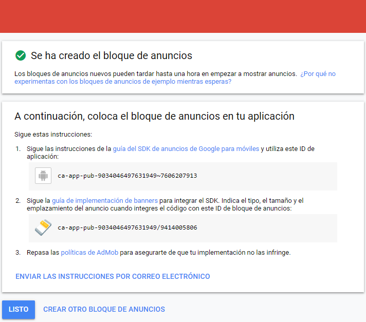 Por ultimo nos entregara primero el ID de Aplicacion y luego el ID de bloque de anuncios, tienen dos opciones para ver como configurarlo, por ultimo presionen Listo para finalizar la creacion de nuestro bloque de anuncios, debera quedar de la siguiente forma