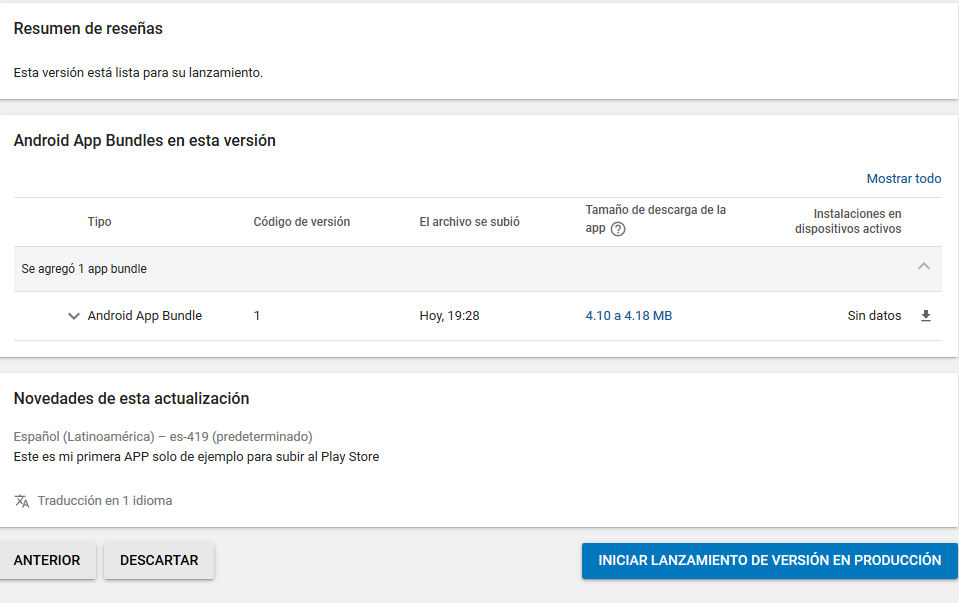 Con esto pueden volver a Versiones de la app, eligen Producion -> Editar version, pulsan el boton Revisar y obtendremos la siguiente pantalla