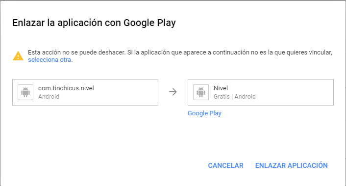 En este caso debemos seleccionar la opcion Enlazar la aplicacion con Google Play donde pasaremos a la siguiente pagina