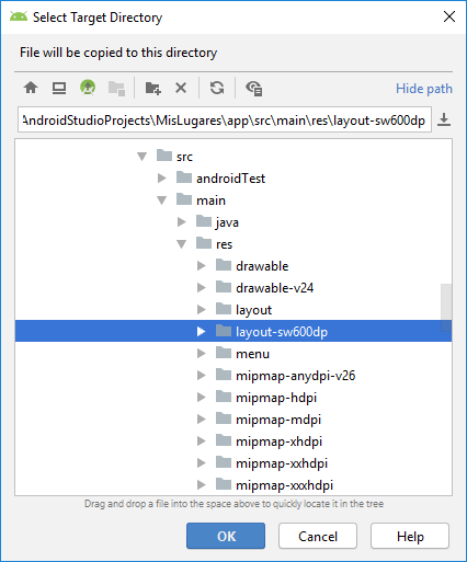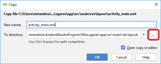 Nuestro siguiente paso sera copiar el archivo activity_main.xml dentro del nuevo recurso, para ello seleccionan el archivo presionan Ctrl+C y luego presionan Ctrl+V donde nos aparecera el siguiente cuadro