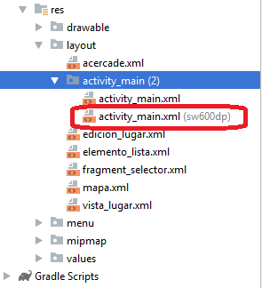 Como pueden ver resalte nuestro nuevo archivo y como nos muestra la aclaracion de sw600dp, esto indicara que utilizara este recurso cuando la pantalla sea de 7″ o mayor y en caso contrario usara el otro archivo.