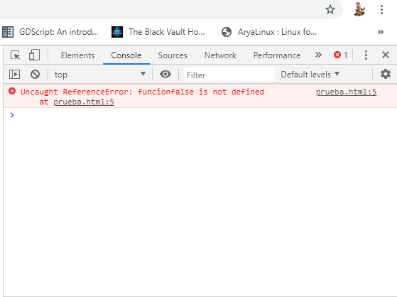 En este caso tenemos un codigo comun en formato web pero llamamos a una funcion que no existe como es funcionfalse, si abrimos la consola veremos la siguiente pantalla