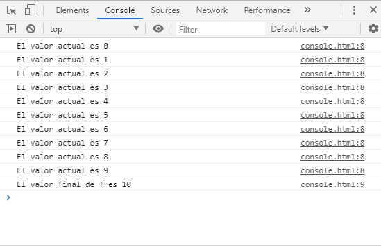 En este caso vemos que nos muestra los valores del 0 al 9 y por ultimo un valor de 10, esto es debido a que los primeros 10 numeros son los del bucle pero como el condicional escribe si f es menor a 10, cuando se incrementa por ultima vez no escribe en la consola pero incrementa a f y cuando volvemos a mostrar a escribir en consola esta vez si nos muestra el valor final de f que es 10.