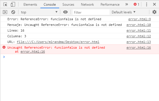 En este caso el tag SCRIPT tendremos varias opciones interesantes, primero hablemos sobre la funcion mostrarerror, en este caso usaremos al evento por medio del atributo evento, luego escribiremos en la consola cada una de las propiedades que vimos antes (error, message, lineno, colno y url), terminada la funcion, creamos el evento por medio de addEventListener donde monitorea al evento error, en caso de suceder llamara a la funcion anterior, luego llamamos a una funcion que no definimos (funcionfalsa) y con esto terminamos el tag SCRIPT, probemos el programa y veamos la salida en la consola