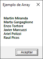 Primero definimos un array que almacenaremos hasta la posicion 5. Es decir, vamos a poder almacenar 6 elementos porque como en cualquier lenguaje la primera posicion sera 0 y desde ahi hasta la posicion 5. Tambien definimos una variable para almacenar el mensaje que mostraremos. Lo siguiente es asignar a cada posicion del array un valor, observen que para cada posicion le pasamos el numero correspondiente. Con nuestros valores asignados, usaremos un bucle for para pasar por todas las posiciones de nuestro array. Para ello usaremos un contador de 0 a 5, en msg asignaremos cada valor recuperado y la posicion se la asignaremos mediante el valor de cada pasada en el bucle. Usamos a vbcrlf para dar el efecto de Enter al final de cada linea. Por ultimo, mostraremos el valor final en pantalla. Veamos como es la salida: