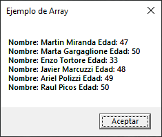 En este nuevo codigo, agregamos una nueva dimension a nuestro array. Este nuevo array se denomina como array tridimensional. Esto vuelve a modificar la forma de almacenar el valor en las distintas posiciones. Tambien lo usaremos para almacenar un nuevo dato en nuestro array. En los bucles hacemos pequeñas modificaciones. La primera es que asignaremos un identificador para los valores del nombre de la persona. En el segundo bucle obtenemos el valor como antes y lo volvemos a asignar pero antes de pasar a la siguiente vuelta en el primer bucle le pasamos un identificador para la edad y el nuevo valor que agregamos. Y aqui agregaremos el vbcrlf para separar cada linea agregada. Por ultimo, mostramos el valor que se genero. Veamos como es la salida:
