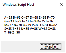 Para este caso usamos un for donde el valor minimo y maximo del contador sera establecido por las dos funciones Asc, ya que una devolvera el valor decimal de A y la otra de Z, luego llenaremos a texto primero con chr para ver a quien corresponde el valor de a y despues le pondremos al lado el valor de a, nuestro siguiente paso sera incrementar i, el siguiente condicional verifica si i es igual a 6, en caso de ser cierto procede a agregar una constante de nueva linea (vbCrLf) que equivaldria a chr(10) que usabamos antes y despues resetea a i al valor de 0, en caso de ser falsa la condicion sigue con el bucle, una vez terminado el bucle nos muestra en pantalla el contenido de texto