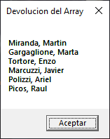 En este caso vamos a tener una variable con todos los nombres y apellidos de las personas llamada lista, a esta la dividiremos con split usando el espacio, en este caso el caracter 32, y lo almacenaremos en l, despues iniciaremos dos variables llamadas b y c con el valor 0, nuestro siguiente paso sera recuperar la informacion de l, para ello usaremos un bucle for donde contaremos desde 0 hasta la ultima posicion de l, esto por medio de ubound, chequeamos si b es mayor que 1 reseteamos a b con el valor de 0 e incrementamos en 1 a c, esto equivaldria a los valores de fila y columna que usabamos antes, donde columna estaba entre 0 y 1 (ahora es b) y fila entre 0 y 5 (ahora es c) despues del condicional enviamos los valores correspondientes para las coordenadas y como valor a este array el valor almacenado en l en la posicion informada por a (el bucle for), despues incrementamos a b, una vez que terminamos lo que tenemos es la misma lista de variables que teniamos antes pero en lugar de hacerlo literal lo hicimos con un bucle for, despues usamos el bucle del ejemplo anterior para recuperar la informacion, asignarla a texto y mostrarla en pantalla, tal como antes