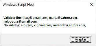 En este caso aplicaremos varias cosas, primero usaremos un inputbox donde le pediremos que ingrese el email, nuestro siguiente paso sera verificar por medio de un bucle for que comenzara desde 1 hasta el valor obtenido por len de la variable correo, nuestro siguiente paso en el bucle sera obtener caracter por caracter por medio de mid, donde le pasaremos a correo pero variaremos al valor de inicio por medio de a (el valor del bucle) y le pasaremos una longitud de 1, nuestro siguiente sera un condicional donde verificara si caracter coincide con el caracter 64 de la tabla ASCII, adivinen cual es: adivinaron la arroba (@), si se cumple a texto le agregamos el correo y el mensaje de que es valido y salimos del bucle for, sino se cumple la condicion a medida que pasemos los ciclos iremos incrementando en 1 el valor de i, este ultimo paso sera crucial para el siguiente condicional donde verificaremos si i es igual al valor que nos devuelve len de correo, si es verdadero (deberia serlo por fuerza) agregara a texto el correo e indicando que no es valido, si lo probamos funcionara de la siguiente manera
