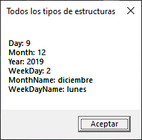 La diferencia esta que ahora con una sola funcion podemos obtener todos los datos necesarios sin necesidad de recordar cada uno de ellos, si lo prueban deberan obtener el mismo resultado que antes, veamos una ultima modificacion para ver las nuevas caracteristicas, para ello agreguemos las siguientes lineas antes del msgbox: