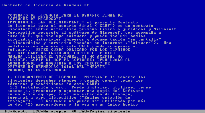 En esta pantalla tendremos el contrato de licencia, como se que no van a leer presionen directamente F8 para pasar a la siguiente pantalla