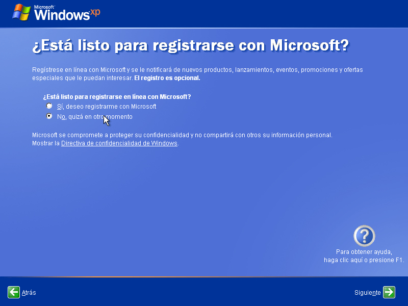 Como no va a ser de produccion, no registraremos el equipo ni tampoco lo actualizaremos, por eso deben seleccionar la opcion que se ve en pantalla y presionen Siguiente