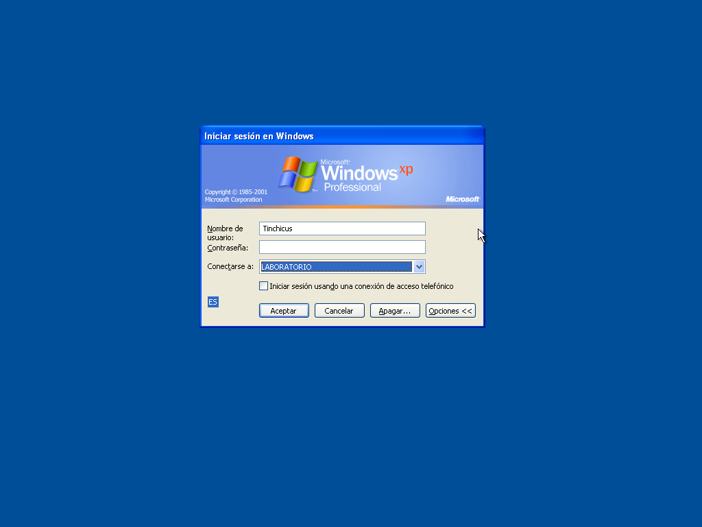 Como pueden ver tenemos ingreso al dominio pero como todavia no tenemos ningun usuario en nuestro dominio no lo podremos usar por ahora, si quieren ingresar al equipo deben ingresar el nombre del usuario local (p.e. tinchicus en mi caso), dejen la contraseña en blanco sino ingresen la que hayan seteado, y en dominio elijan el nombre del equipo o pueden ingresar el nombre del equipo\nombre del usuario (p.e. xp001vrt\tinchicus), con esto podran ingresar localmente pero no al dominio.