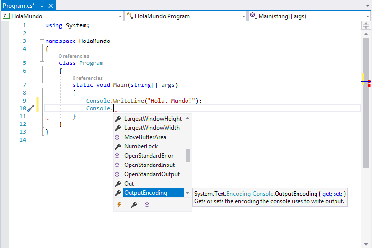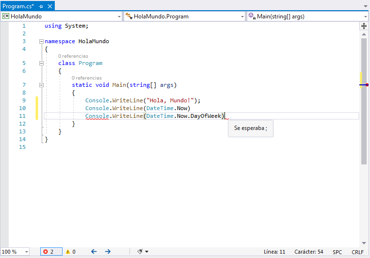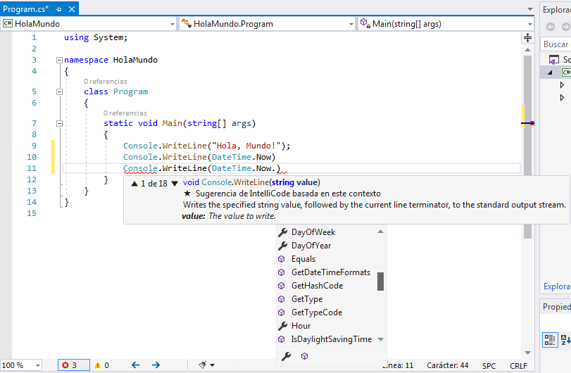 En este ejemplo primero eliminamos todas las lineas innecesarias de using, agregamos dentro de Main las lineas faltantes para que nos muestre las lineas de Hola, Mundo, la hora y fecha y el dia de la semana, veamos lo bueno de utilizar Visual Studio, mientras escribimos en nuestro codigo nos ira sugiriendo las posibilidades