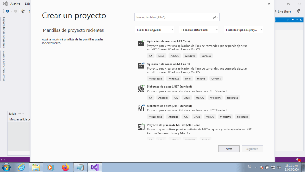 Aqui tendremos disponibles todos los proyectos que podemos generar con Visual Studio, tendremos tres opciones para filtrar nuestros proyectos, en la primera opcion sera el lenguaje, en el segundo elegiremos el sistema operativo de destino y por ultimo el tipo de proyecto, para nuestro caso deberemos elegir: