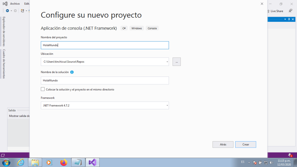 En esta nueva ventana ingresaremos el nombre del Proyecto, para este primer codigo sera HolaMundo, la ubicacion donde ira nuestro codigo, pueden dejarlo en la ubicacion predeterminada, el nombre de la solucion, el cual se generara automaticamente cuando asignemos el nombre del Proyecto, y por ultimo la version de Framework, cuando terminemos de configurarlo presionamos Crear dando comienzo a la creacion de nuestro proyecto, una vez terminado nos quedara de la siguiente forma
