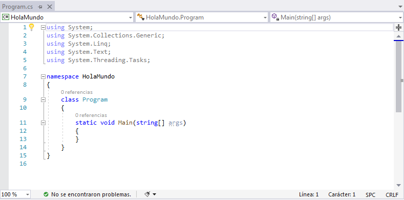 Despues tenemos la clase que contendra nuestro programa, este lenguaje cuando no especificamos el tipo de acceso asume automaticamente que es internal, de lo cual ya hemos hablado en este post , despues nos genero el Main como mencione en otros posts con el tipo void y nos agrego un variable que veremos mas adelante (args), dentro de Main no agrego nada dejandolo listo para ser usado, como usamos void y no int en este caso no es necesario la linea return 0 que utilizamos hasta ahora para salir de la funcion, vamos a modificar el codigo para que se asemeje al que vimos en los primeros posts: