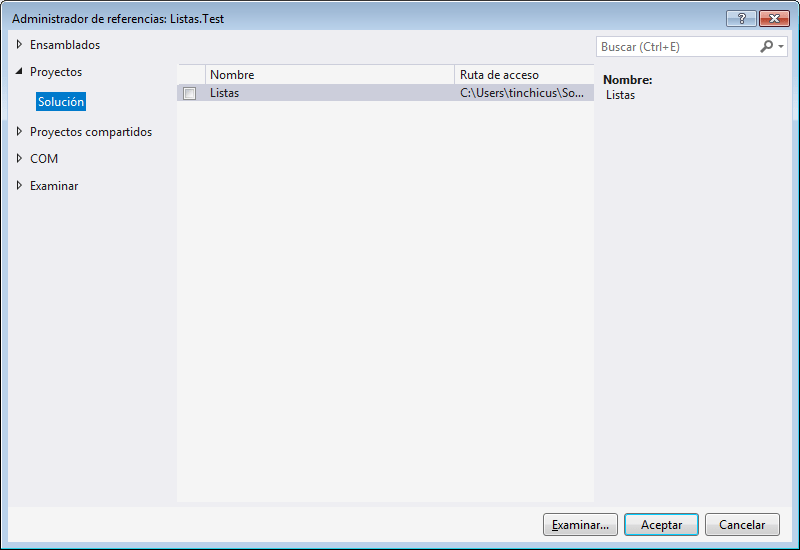 Si investigamos un poco tendremos la opcion de crear una clase de test unitario pero para este caso elegiremos Class y lo llamaremos ListasTests.cs, una vez hecho presionen Aceptar para crear la nueva clase, si nosotros intentaramos trabajar ahora con nuestro otro proyecto no podriamos porque no esta referenciado, para solucionar esto debemos hacer click con el boton derecho sobre las referencias del proyecto Listas.Test y usar Agregar referencia donde aparecera el siguiente cuadro
