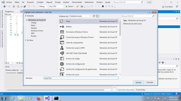 Una vez creada vamos a llamarla Clases y sera nuestro lugar para almacenar las nuevas clases que vayamos necesitando, una vez generada vamos a hacer click con el boton derecho y seleccionamos Agregar -> Nuevo Elemento donde aparecera el siguiente cuadro