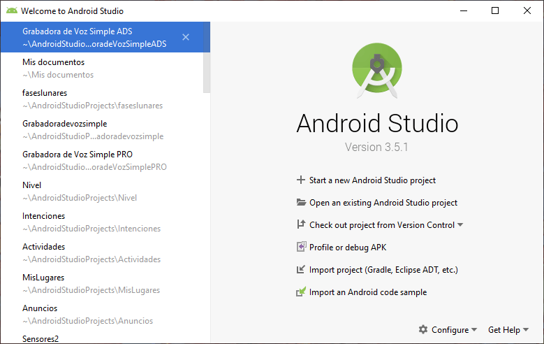 En este caso a la izquierda les apareceran los proyectos con los cuales trabajaron antes, en mi caso los del curso inicial de Android, y a la derecha tendran las opciones disponibles, para crear nuevos proyectos, abrir existentes, importar desde otro IDE (Entorno de desarrollo integrado) como por ejemplo Eclipse o hacer una depuracion de un APK, estos lo usaremos a medida que los vayamos necesitando.