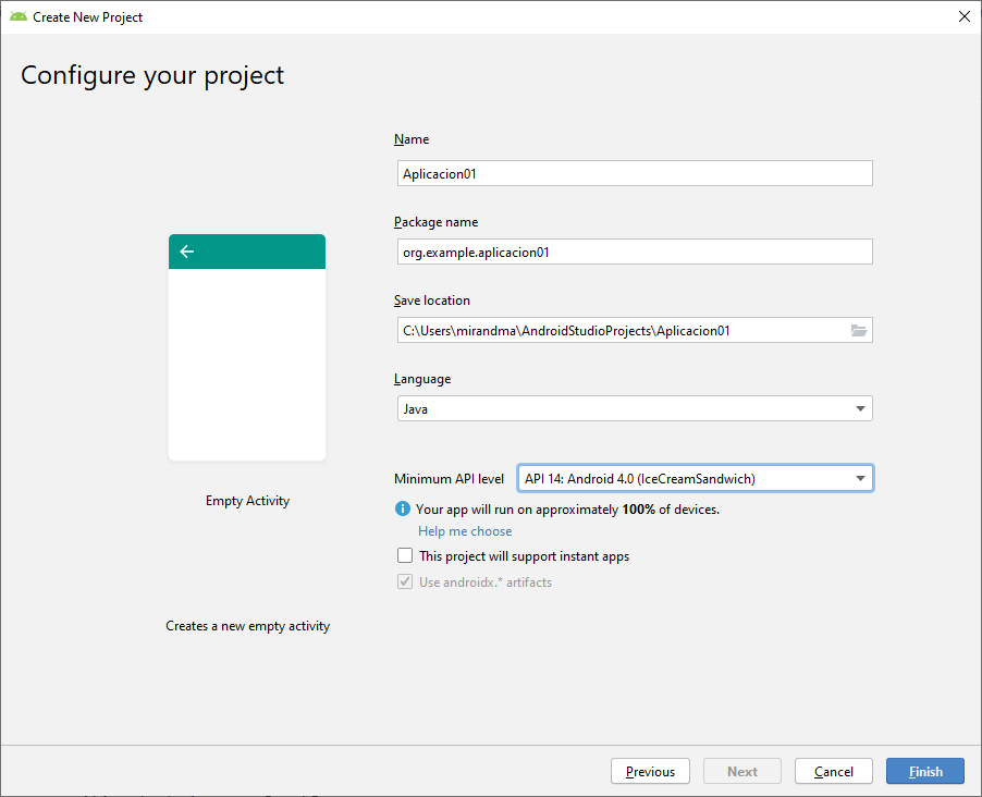 En este caso definiremos los datos de nuestra aplicacion, el primero sera el nombre de la aplicacion en si, para este caso le asigne Aplicacion01, en el nombre del paquete deberan usar un dominio para identificarlo, por ejemplo si yo quisiera subir esta aplicacion a algun store deberia haberlo llamado com.tinchicus.aplicacion01 porque nos permitira subirlo y no se deberia repetir con ningun otro paquete pero para nuestros ejercicios no usaremos un dominio propio sino uno de ejemplo como es example.org pero este dominio no nos permitira cargarlo a ningun store.