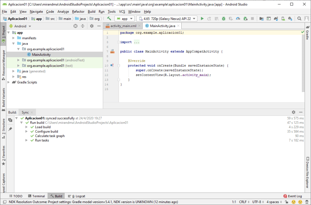 Estas seran nuestros tres paneles mas basicos, en el de la izquierda veran como es la estructura de nuestra app, a la derecha veremos los codigos tanto de las interfaces hechas en XML como las clases de Java, en la parte inferior veremos tanto el log como lo sucedido mientras compilemos y sincronicemos nuestro proyecto con gradle files.