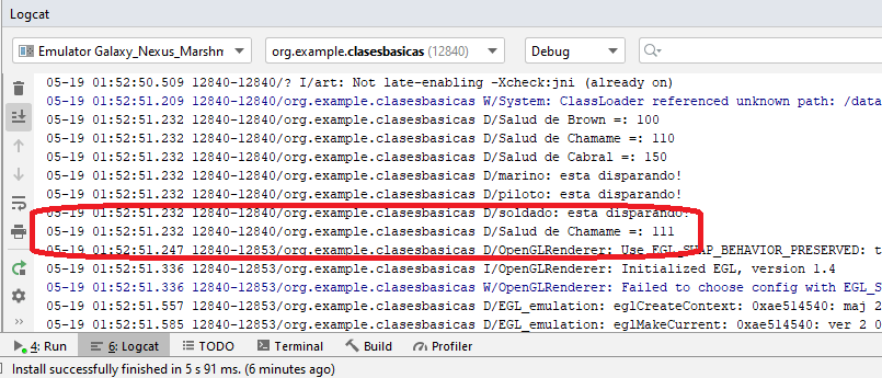 Esta clase la usaremos como principal para ello extendemos a Activity, luego sobreescribiremos a onCreate, tal como se hace siempre, usamos el super para corregir el error que nos genera, nuestro siguiente paso sera crear tres objeto de la clase Soldado, el siguiente paso sera definir la salud y el tipo de soldado para cada uno de ellos, despues tenemos un bloque donde por medio de Log.d mostramos la salud de cada uno de ellos y por ultimo los hacemos disparar, si lo ejecutamos veremos lo siguiente