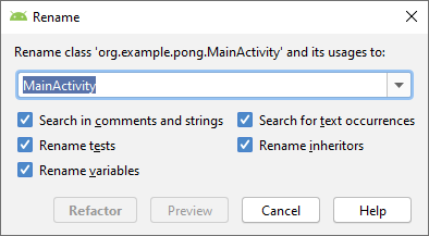 En este caso deben reemplazar el valor MainActivity por PongActivity, las opciones deben quedar tildadas como se ven, una vez cambiada el nombre se habilita el boton Refactor, lo presionan y va a hacer todas las modificaciones y nos quedara el archivo de la siguiente manera