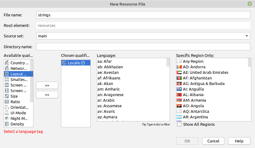 En este caso completen el valor de File name con strings, no se preocupen por el nombre porque debe ser ese, el resto debe quedar como se ve, el proximos paso sera seleccionar Locale y presionar el boton con el simbolo >> lo cual hara aparecer el siguiente cuadro