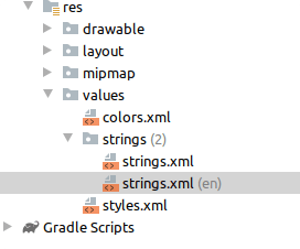 Ahora tendremos dos archivos strings.xml pero en el caso del nuevo recurso tiene entre parentesis la palabra en, esto le indica al lenguaje que esto es para cuando el dispositivo este en ingles y no en español como es nuestro caso, esto nos genero un archivo vacio pero lo llenaremos de la siguiente manera: