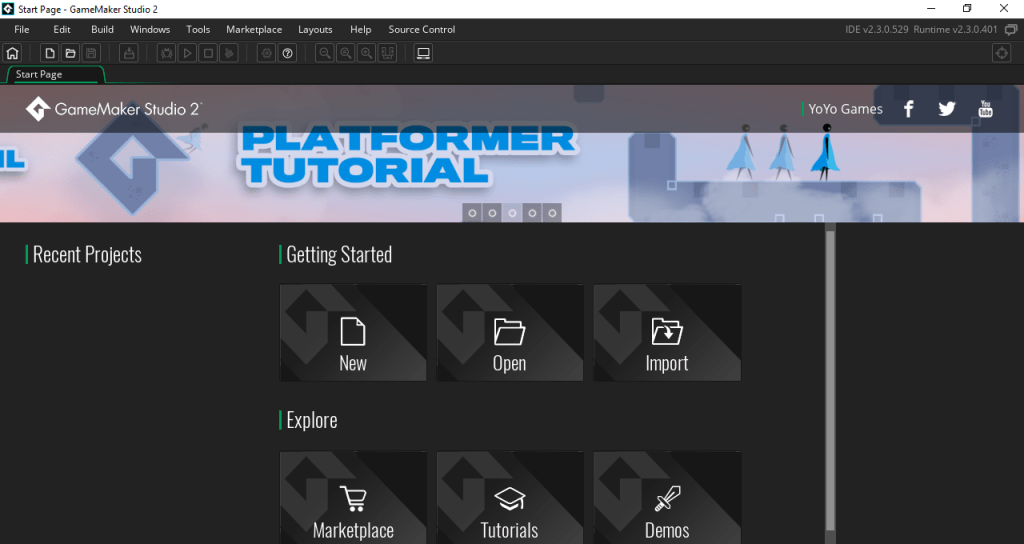 En la imagen tenemos varios botones, con el primero podemos crear nuevos proyectos, el segundo nos permite abrir uno y el tercero sera para importar alguno, el MarketPlace sera para comprar licencias, proyectos y demas cosas, tutorials es para acceder a tutoriales gratuitos (hasta donde vi), y Demos de juegos para descargar, probar y ver su codigo, a su izquierda tendremos el listado de los proyectos que habemos estado trabajando, en este caso esta vacio porque todavia no creamos nada, por ultimo tenemos el menu: