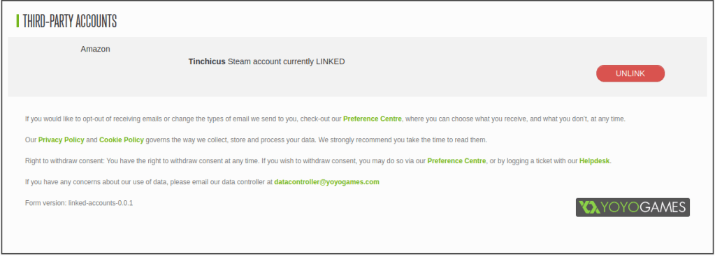 Esta opcion nos permite vincular nuestra cuenta de YoYoGames con nuestra cuenta de Steam o Amazon, una vez seleccionada nos aparecera a la derecha de este menu la siguiente opcion