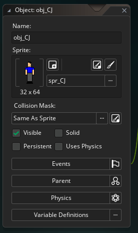 Para ello debemos volver al Asset browser, buscamos la carpeta llamada Objects y presionamos click con el boton derecho y seleccionamos Create -> Object, nos aparecera una nueva ventana en la cual pondremos el nombre como obj_CJ y en sprite seleccionen el que creamos anteriormente, nos quedara de la siguiente manera