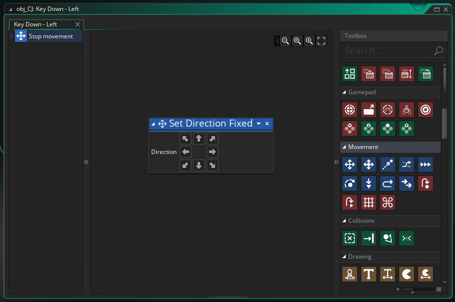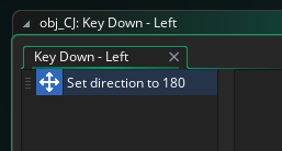 El siguiente paso sera agregar un Evento para ello presionen Add Event y seleccionen Key Down -> Left, nos aparecera una nueva ventana con las acciones que tenemos disponibles, entre ellas busquen Movement y dentro de estas acciones hay una llamada Set Direction Fixed, la arrastran en el panel central nos quedara de la siguiente manera