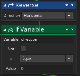 Esto simboliza que si es verdad la condicion anterior, es decir que este objeto esta en colision con la pared procede a ejecutar la accion Reverse, esta sera para invertir el valor de la direccion, es decir si esta yendo a la derecha cambiara la direccion a la izquierda y viceversa, tambien aplica para las direcciones verticales, basicamente lo que hace agregar 180° al valor actual, y en caso de pasarse de los 360° empieza desde 0°, con lo cual cuando estemos en 270°, por ejemplo, lo convertira en 90°, esto podemos hacerlo tanto en las direcciones como en horizontal, en vertical o con la gravedad, para nuestro caso estableceremos Horizontal para que afecte unicamente este movimiento, el siguiente paso sera agregar un condicional para cambiar el sprite de acuerdo a donde se desplaza, para ello agregaremos la accion condicional (If variable) que esta en las acciones Common, esta si debemos arrastrarla debajo de la accion anterior y quedara de la siguiente manera