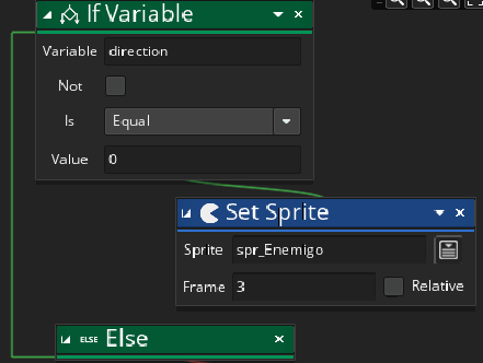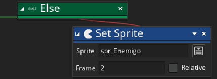 Una breve explicacion de algo que veremos mas adelante mucho mas profundamente, el condicional if se usa para verificar que una condicion sea verdadera o no y en caso de ser verdadera se ejecuta pero en caso de ser falsa es capturada por else y ejecuta otro bloque de acciones, en este caso si la direccion es a la derecha, o sea 0°, setea el frame 3 del sprite pero en caso de no ser asi, es decir que es de 180° recuerden que solo vemos el eje horizontal, ejecutara la accion que le pasemos a else, en este caso agregamos otro Set Sprite y como en el caso anterior debemos arrastrarlo a la derecha de la ventana Else, quedando de la siguiente forma