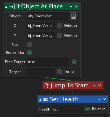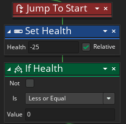 Esta accion hara que nuestro heroe vuelva al punto de inicio cada vez que haya una colision, esto nos es util para evitar que nuestro personaje muera por quedar atrapado entre una pared y el enemigo, el siguiente paso sera agregar la ultima accion, en este caso iremos a Instance Variables y buscaremos la accion Set Health y la ubicamos debajo de Jump To Start, quedara de la siguiente forma