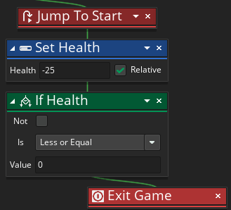 En este condicional lo unico que modificaremos es en la opcion Is donde usaremos Less or Equal y en Value dejaremos a 0, con esto le diremos que si health es menor o igual a 0 ejecute la accion que vamos a agregar, y esta la encontramos dentro de las acciones de Game, buscamos y tomamos a Exit Game, la arrastramos al lado derecho de este condicional para que al cumplirse la condicion la ejecute, quedando de la siguiente manera