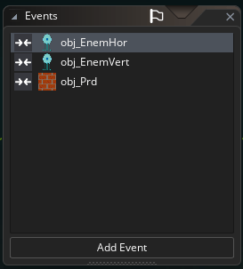 Creamos un nuevo objeto, como hasta ahora, lo llamaremos obj_BalaIzq, le asignaremos el Sprite que creamos anteriormente, y por ultimo lo asignamos como Solido, nuestro siguiente paso sera agregar un evento, en este caso agregaremos cuatro eventos de colision; uno por cada enemigo, otro para la pared y para el momento de la creacion, en esta ocasion solo agregaremos los eventos de colision, una vez agregados los eventos deberemos agregar dos acciones a cada uno de los enemigos, tomemos como ejemplo al obj_EnemVert.
