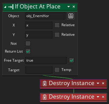 Este condicional verifica que el objeto coincide con los ejes del objeto de la bala para luego proceder a ejecutar dos acciones, nuestro siguiente paso sera agregar estas dos acciones, las dos son la misma pero para distintos elementos, la accion es Destroy Instance que se encuentra en Instances, nos debera quedar de la siguiente manera