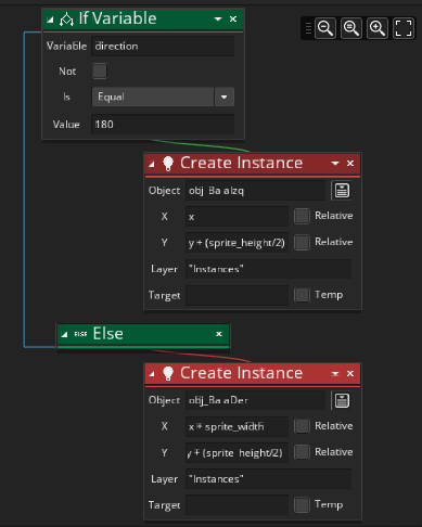 El resto quedara como aparece, con esto generamos una nueva instancia del objeto obj_BalaIzq la cual cada una sera independiente de la otra, esto nos permitira disparar a discrecion sin tener inconvenientes, a este condicional le agregaremos un else donde le diremos que genere una nueva instancia pero esta vez de obj_BalaDer y para ello lo configuraremos de la siguiente manera: